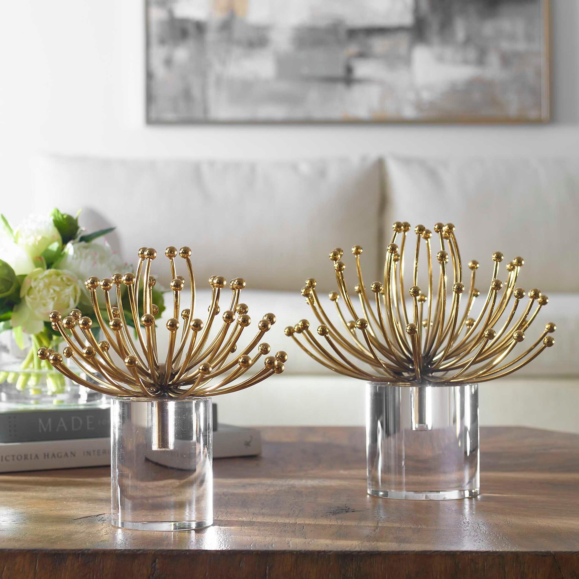 Displaying An Elevated Contemporary Feel, These Steel Objects Are Finished In An Elegant Brushed Gold Atop Large Crystal Bases. Sizes: S-7x9x7, L-9x10x9