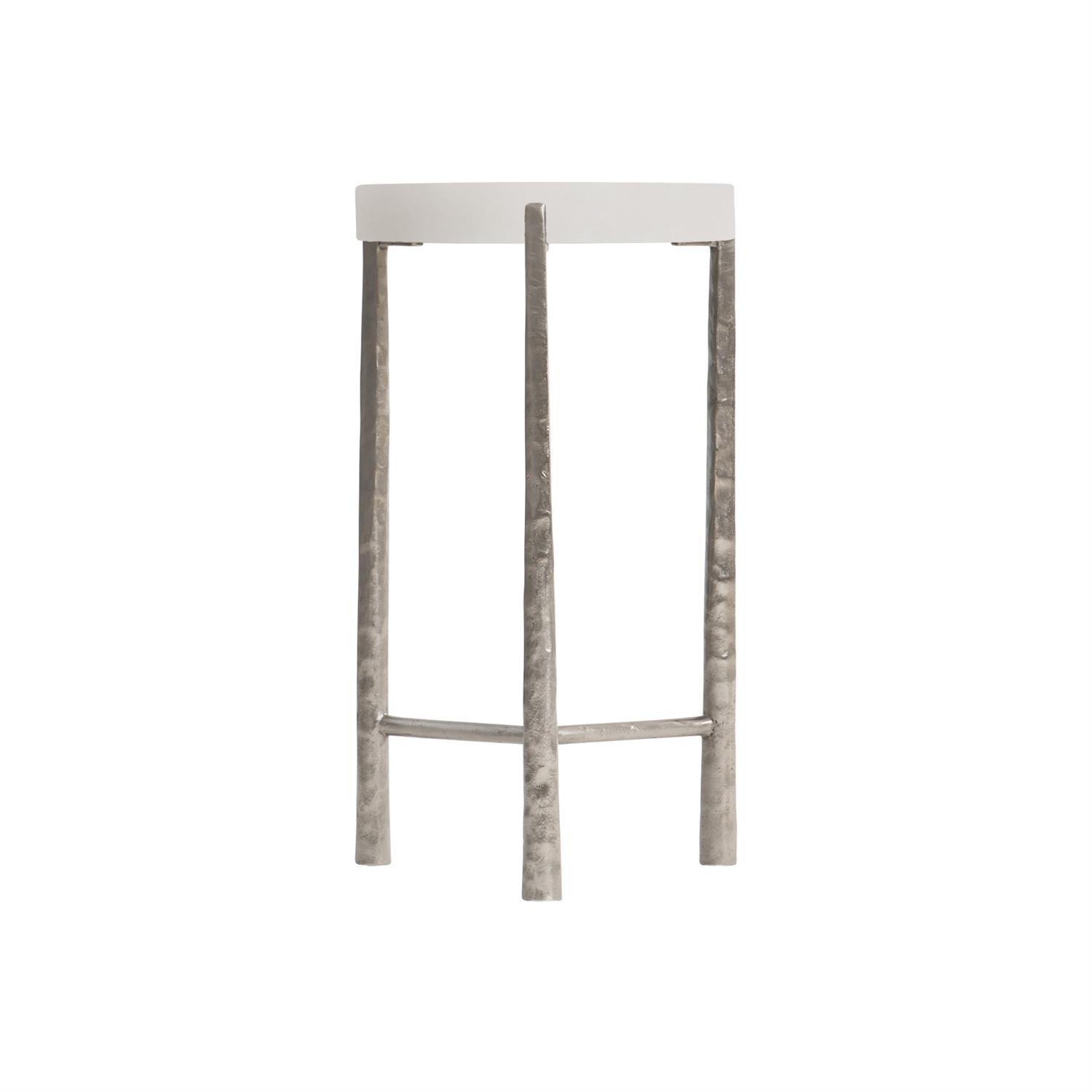 Round Accent Table With Tusk Faux Stone Finished Top And Metal Base With Stretchers In Frosted Nickel Finish. Legs Taper Out Slightly. Ajdustable Glides